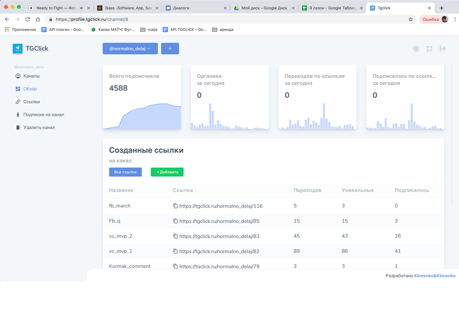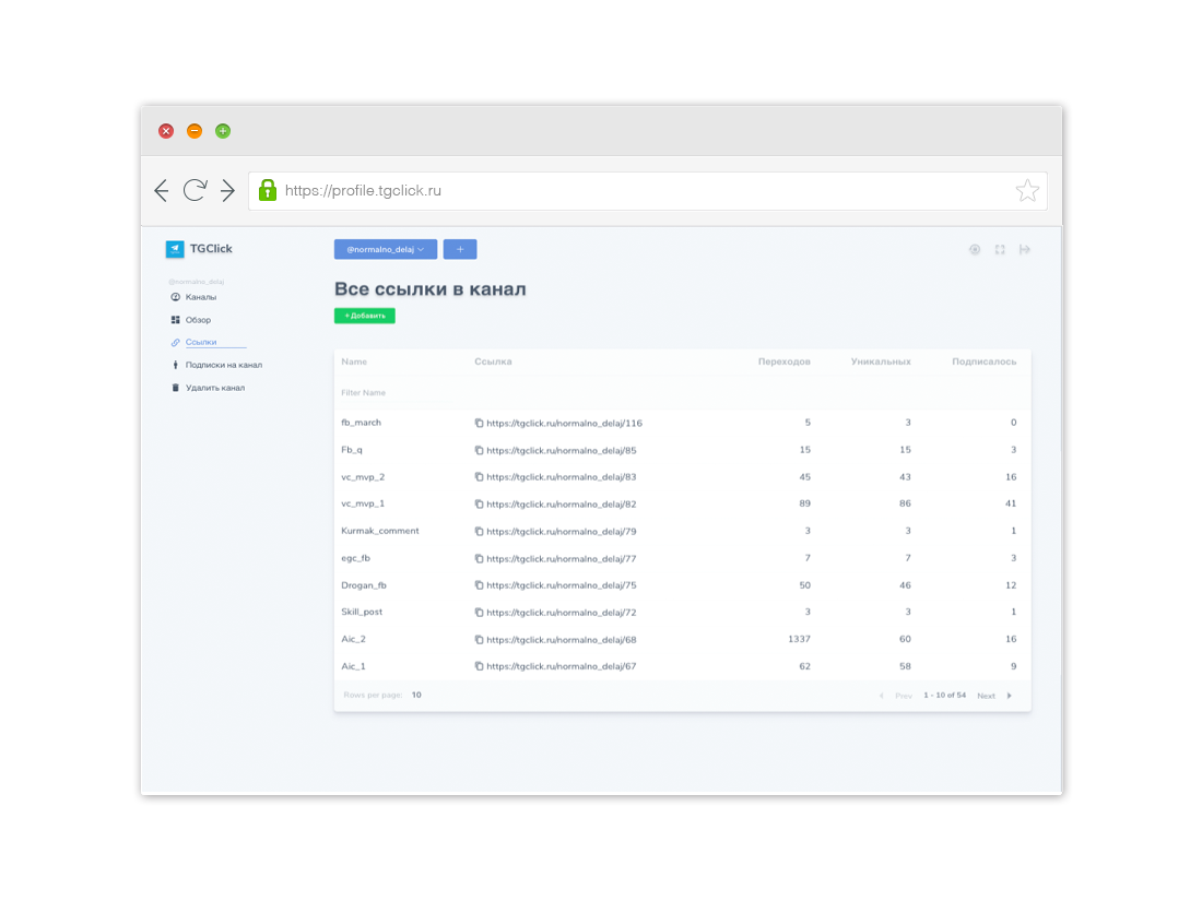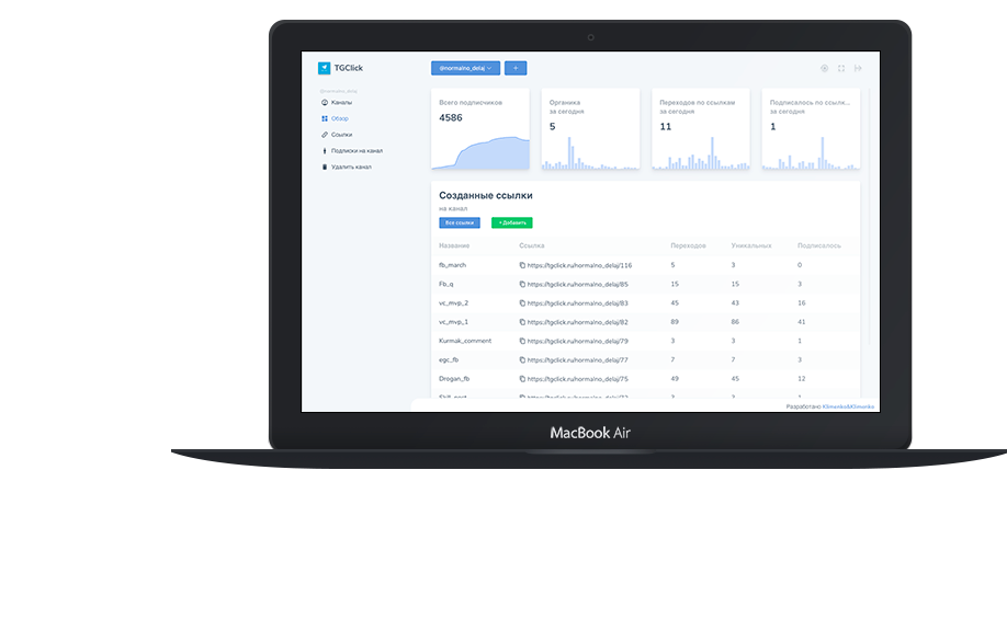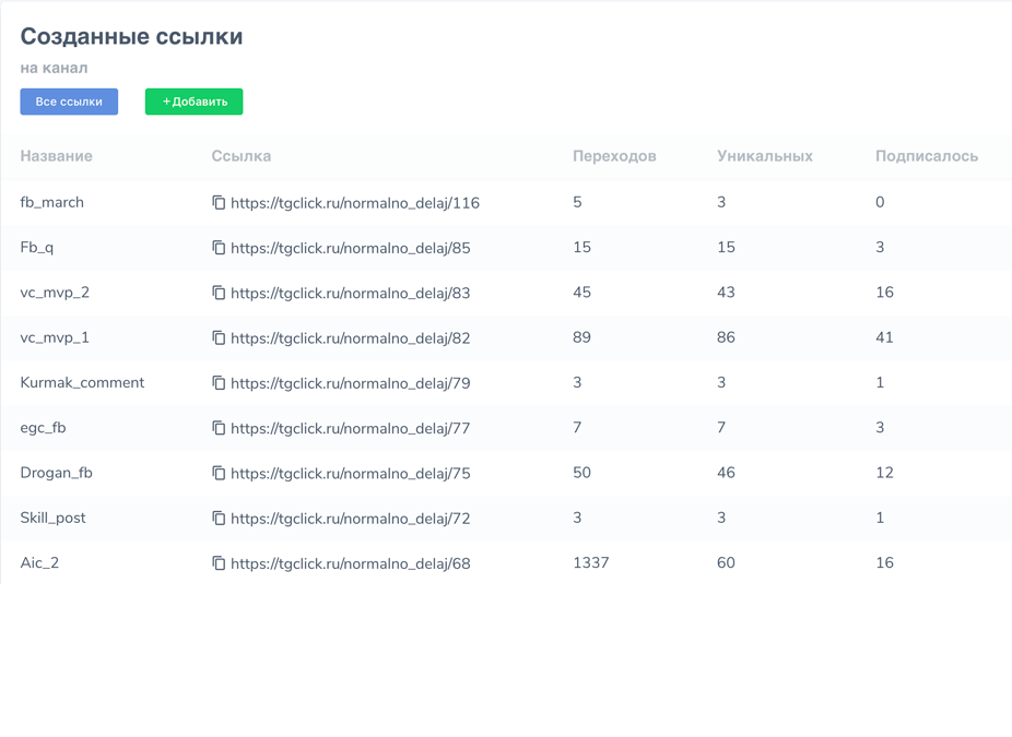 По каждой ссылке ведется статистика переходов и подписок.
